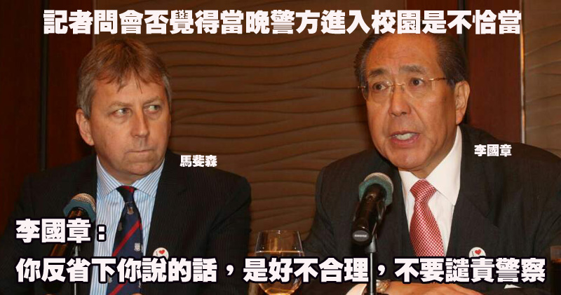 至於當晚警方進入校園是否不恰當,李國章在未有聽畢整條問題即「疊聲」發言,指警方是要維持秩序,更向發問的記者表示,「你反省下你說的話,是好不合理......不要譴責警察」。