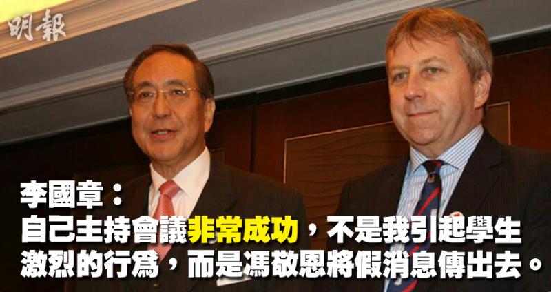 港大校委會主席李國章前晚首次主持港大校務委員會會議,即遇上學生抗議,場面混亂。李國章認為自己主持會議非常成功,委員亦有讚他,但因學生代表、學生會會長馮敬恩將「假消息」傳出去,才激發學生行動。