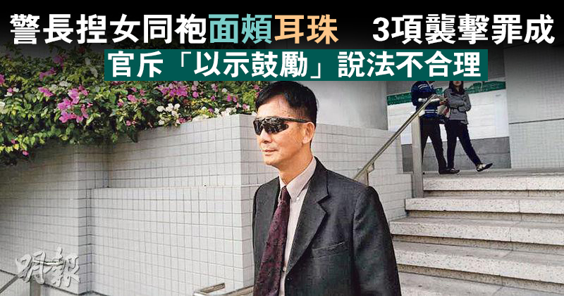 警署警長涉在報案室內揑女同袍的面頰及耳珠,又拍打她的臀部,警察否認3項普通襲擊及1項猥褻侵犯罪早前受審。對於被告早前辯稱揑事主兩頰及耳珠是以示鼓勵等,裁判官今裁決時指出,被告的說法不合常理,其舉動超越一般日常可接受的行為,裁定被告3項普通襲擊罪成,惟事主未能清晰及一致指出她被拍打的部位,故裁定被告猥褻侵犯罪名不成立。