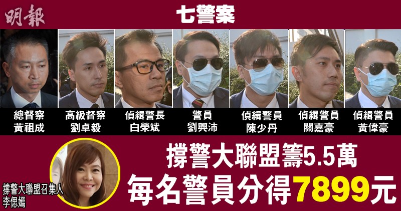 兩個組織在2月20日成立「支援七警家屬生活費基金」,兩個組織昨宣布,至上月15日,共籌得逾5.5萬元。香港警察員佐級協會創建人暨退役同僚會主席謝國堅表示,每筆捐款金額由100元至數千元不等,有50項筆款項,合共55295.3元,已將金額平分予7名警員,每人可得7899.3,每張支票的收款人為7名警員,他們稍後將支票交予家屬代表。