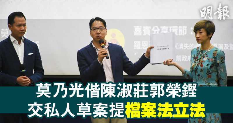 立法會議員莫乃光、陳淑莊及郭榮鏗,聯合以私人條例草案形式提交《公共檔案條例草案》,尋求為檔案法立法。莫已按程序於上周四(4月27日)將草案呈交律政司,並去信立法會政制事務委員會要求加入議程討論。