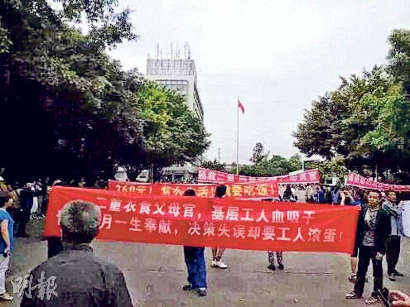 【明報專訊】四川德陽市擁有兩萬員工的央企兵工廠前日發生大規模工潮,工人指摘工廠領導腐敗,導致虧損數十億元(人民幣,下同)面臨破產,目前只能給每名員工每月發放360元的低保費,逾萬工人走上街頭維權,聲討領導層。 如要讀取全文,請按此訂閱或續訂明報電子報服務。現有訂戶請按此登入。